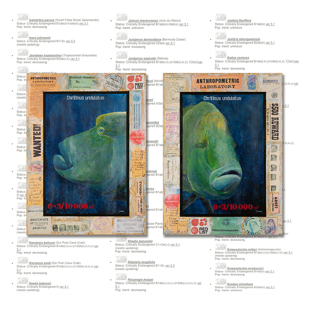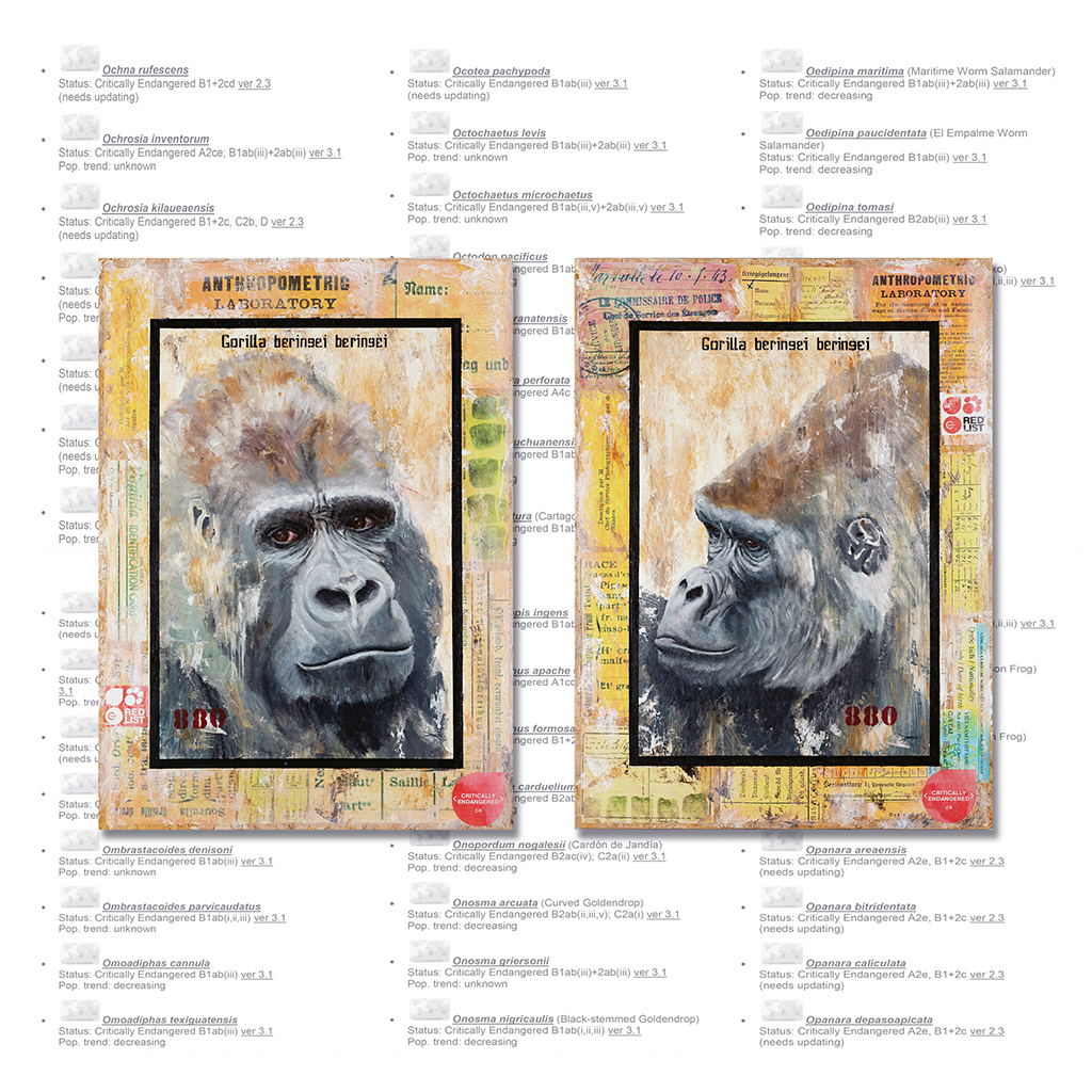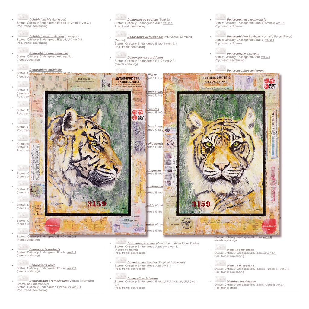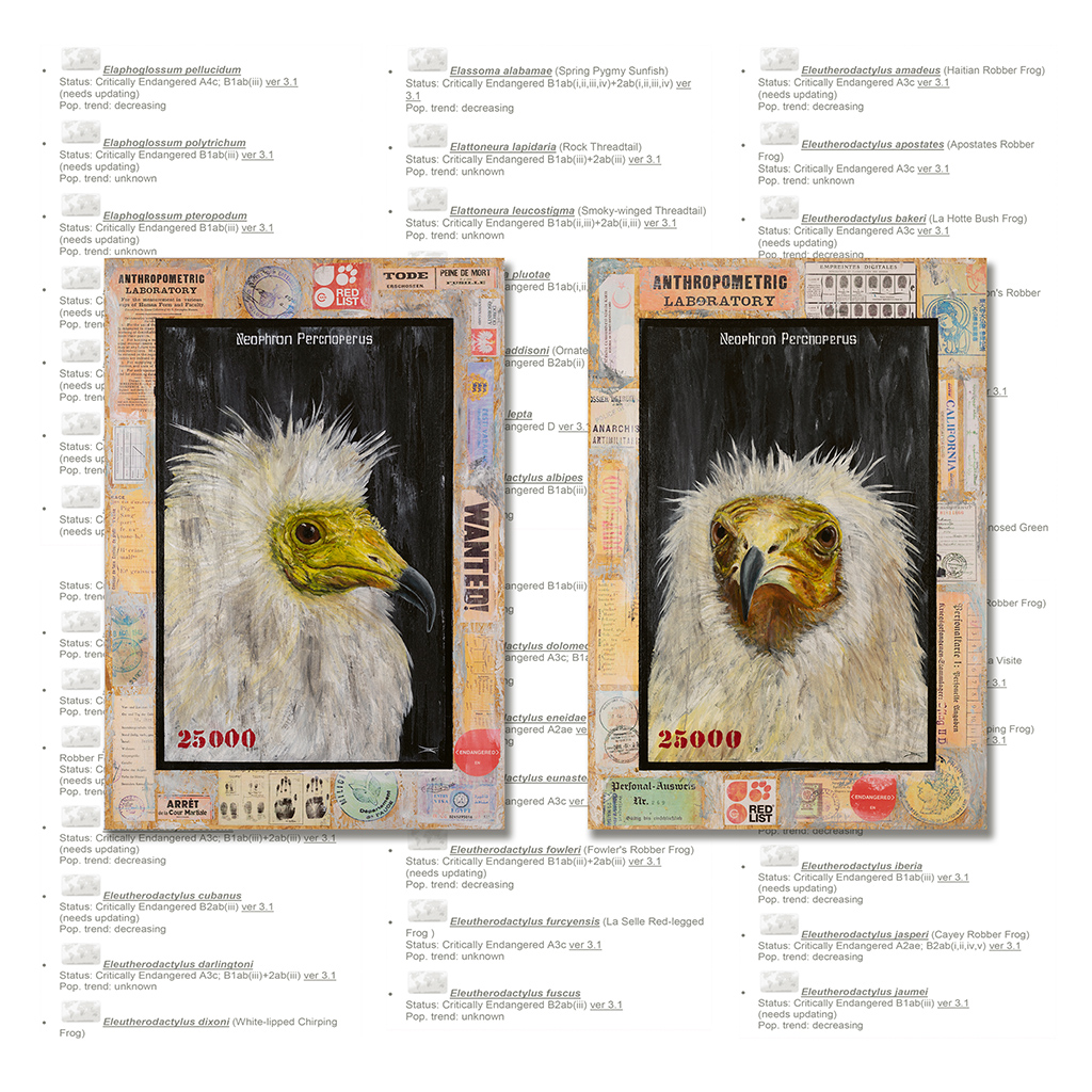 Installation composée de 16 tableaux représentant huit espèces animales menacées,